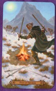 The Five of swords in the Spell Caster’s deck gives me the idea of a hit and run.